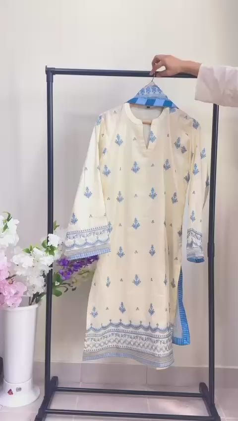 Intricate Embroidery: The off-white shirt is beautifully adorned with delicate Schiffli and Thread Embroidery in a soothing azure blue, featuring elegant floral and heritage patterns on the neckline and sleeves.