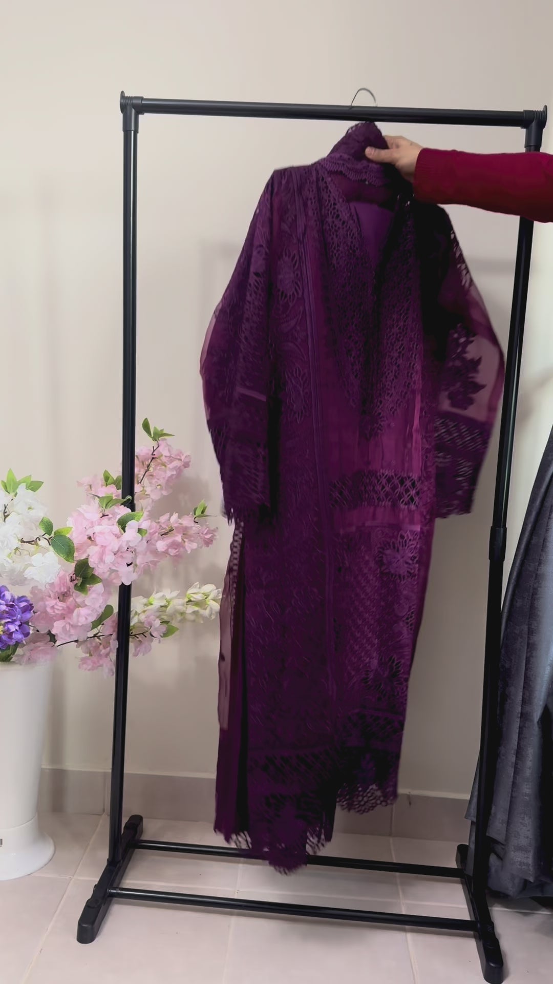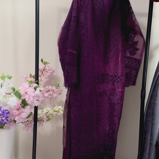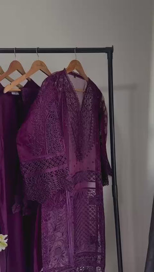 Step into a world of luxury with our signature three-piece suit in a stunning Royal Plum hue. Perfect for formal gatherings and wedding festivities, this dress is a testament to exquisite Pakistani craftsmanship.